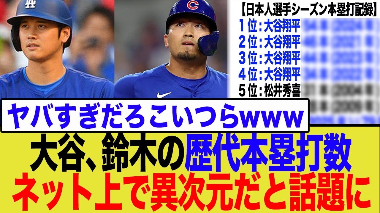 メジャーリーグで大谷翔平選手と鈴木誠也選手がホームランを量産中!大谷選手は年間53本ペースと、自身の持つ日本人最多記録更新も視野に。鈴木選手も年間40本超えの勢いで、松井秀喜選手の記録にも迫ります。日本人メジャーリーガーのホームラン記録の歴史を塗り替える瞬間に注目!動画では、最新の成績や過去のランキングを基に、彼らの凄さを分かりやすく解説し、ネットの様々な反応もご紹介します。今後の活躍やWBCへの期待など、ファンの熱いコメントも満載です。ぜひ最後までご覧ください!高評価とチャンネル登録もお願いします。
