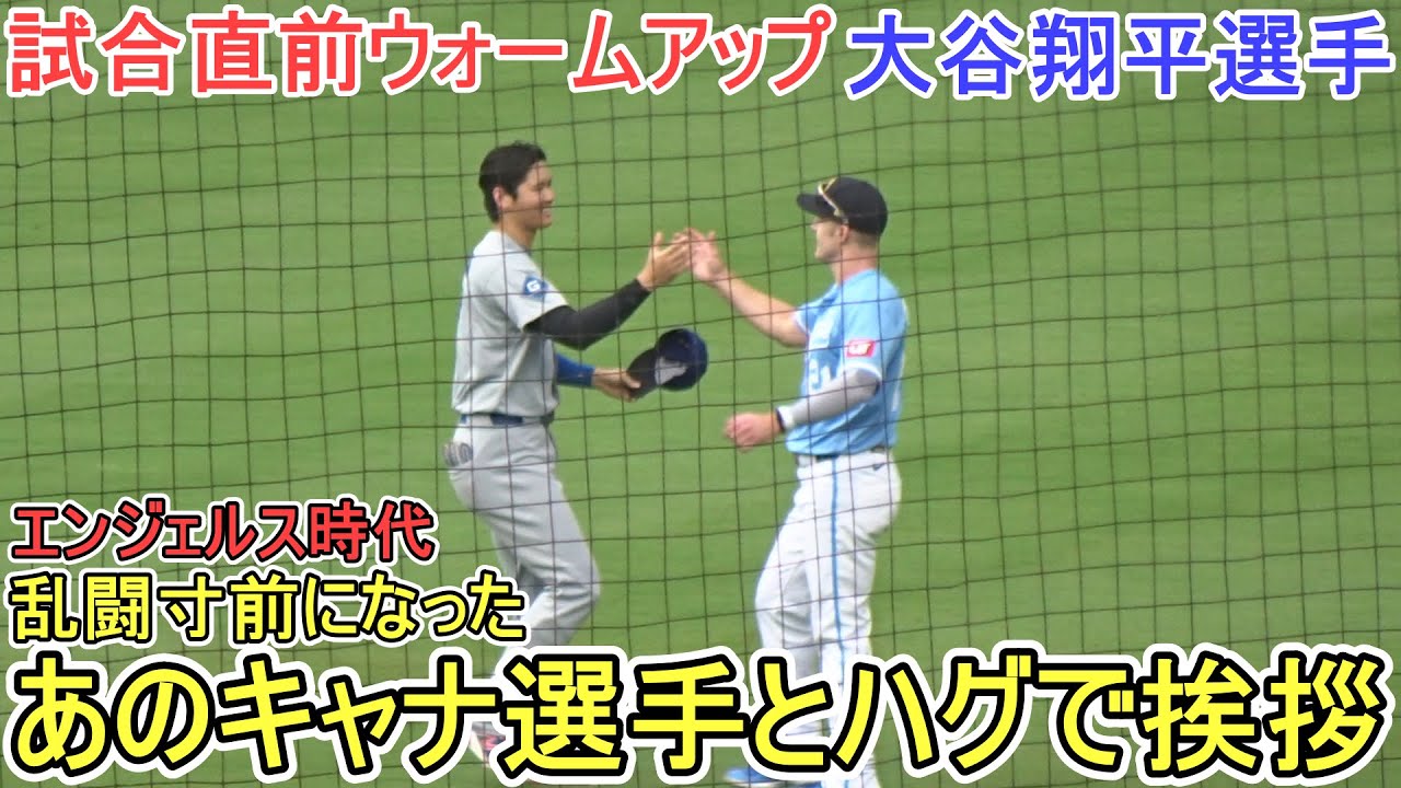 ♦試合直前ウォームアップ♦エンジェルス時代乱闘寸前までいったマーク・キャナ選手とハグで挨拶をする大谷翔平選手。
