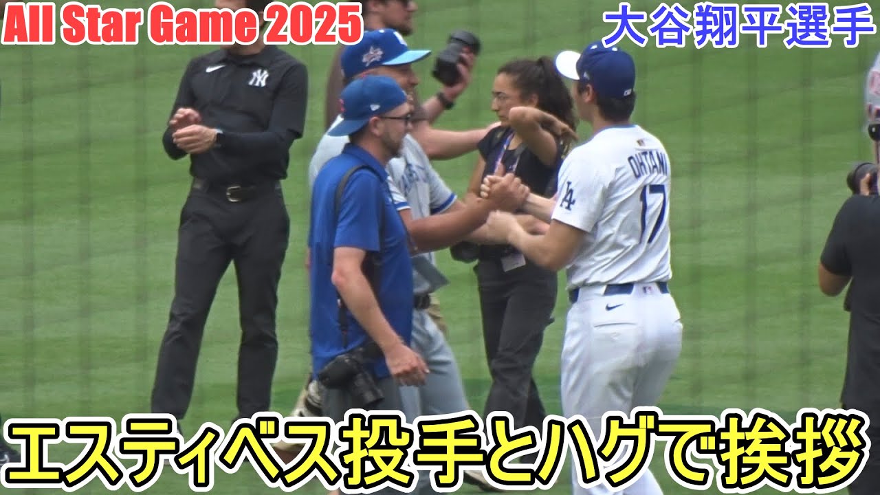 ♦チームフォト♦駆け寄って元エンジェルスのチームメイトのカルロス・エスティベス投手とハグで挨拶。