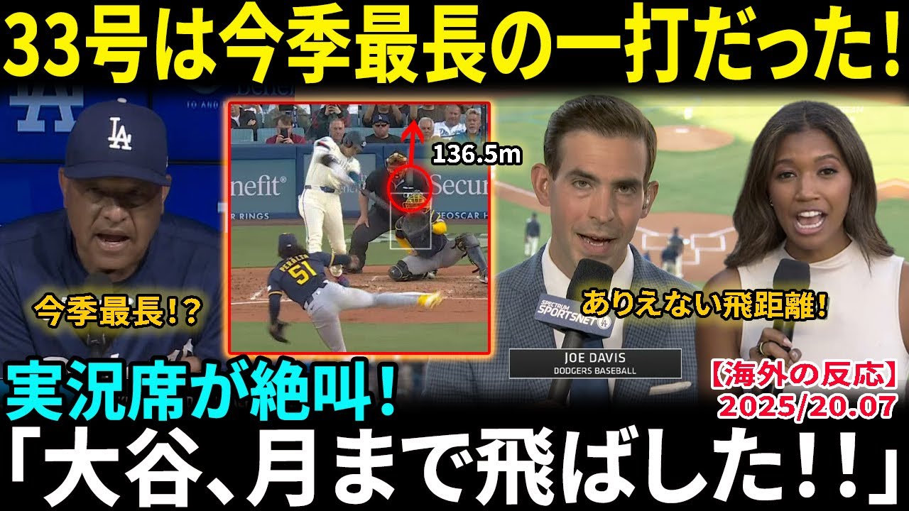 【大谷翔平】今季最長弾か!?ドジャースタジアムが大爆発した33号ホームラン炸裂!「ドジャースが闘志を呼び起こした!」米実況席が絶叫で大興奮!【海外の反応/MLB/野球】