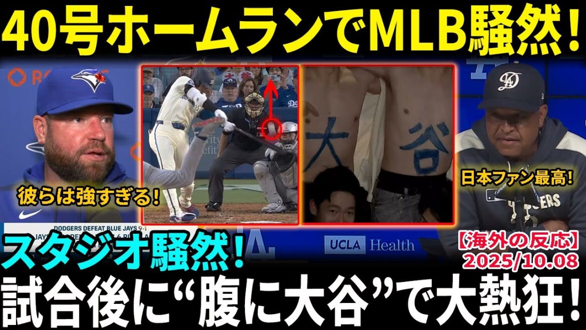 大谷翔平がついに40号ホームランを放ち、MLB中が騒然!ブレイク・スネルは10奪三振の圧巻投球、ドジャースはブルージェイズに9-1で圧勝。試合後には“腹に大谷”と書いた日本人ファンがスタジオ裏で大熱狂!この瞬間、球場もファンも一つになった!
