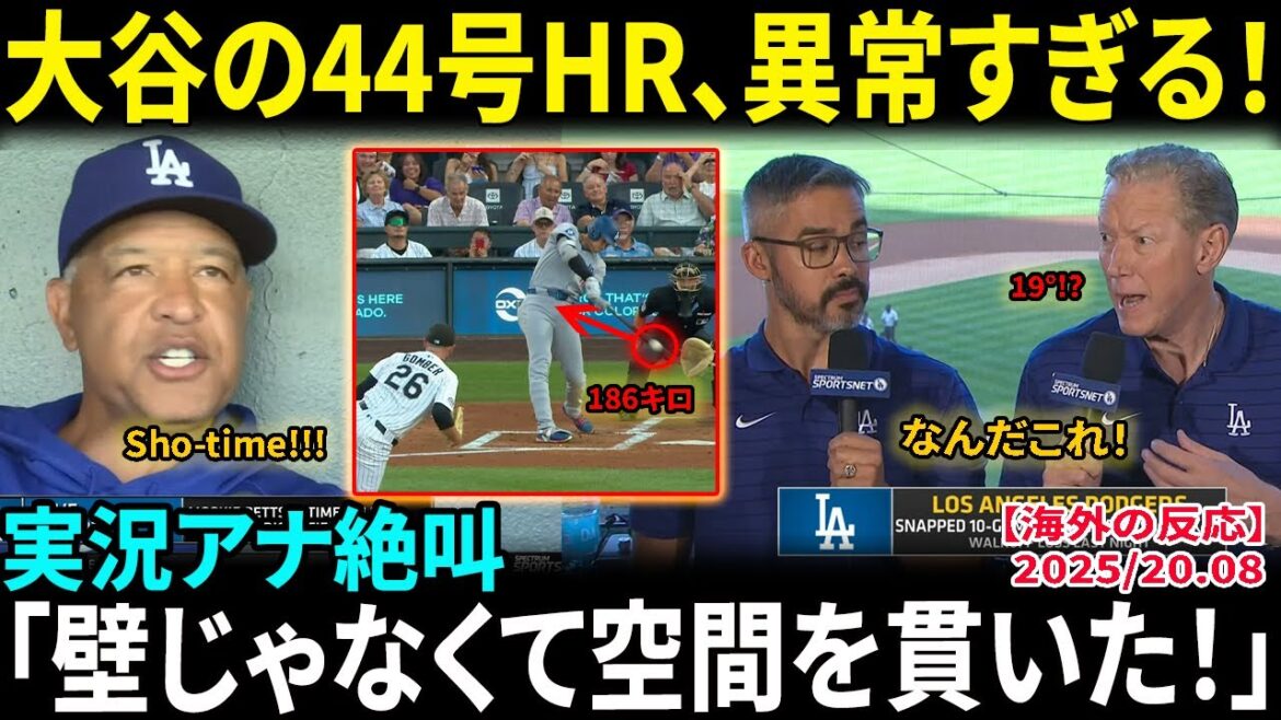【大谷翔平】44号ホームランは角度19度・時速186キロの“超常弾”!実況アナ絶叫「壁じゃなくて空間を貫いた!」MLB全体が騒然【海外の反応/MLB/野球】