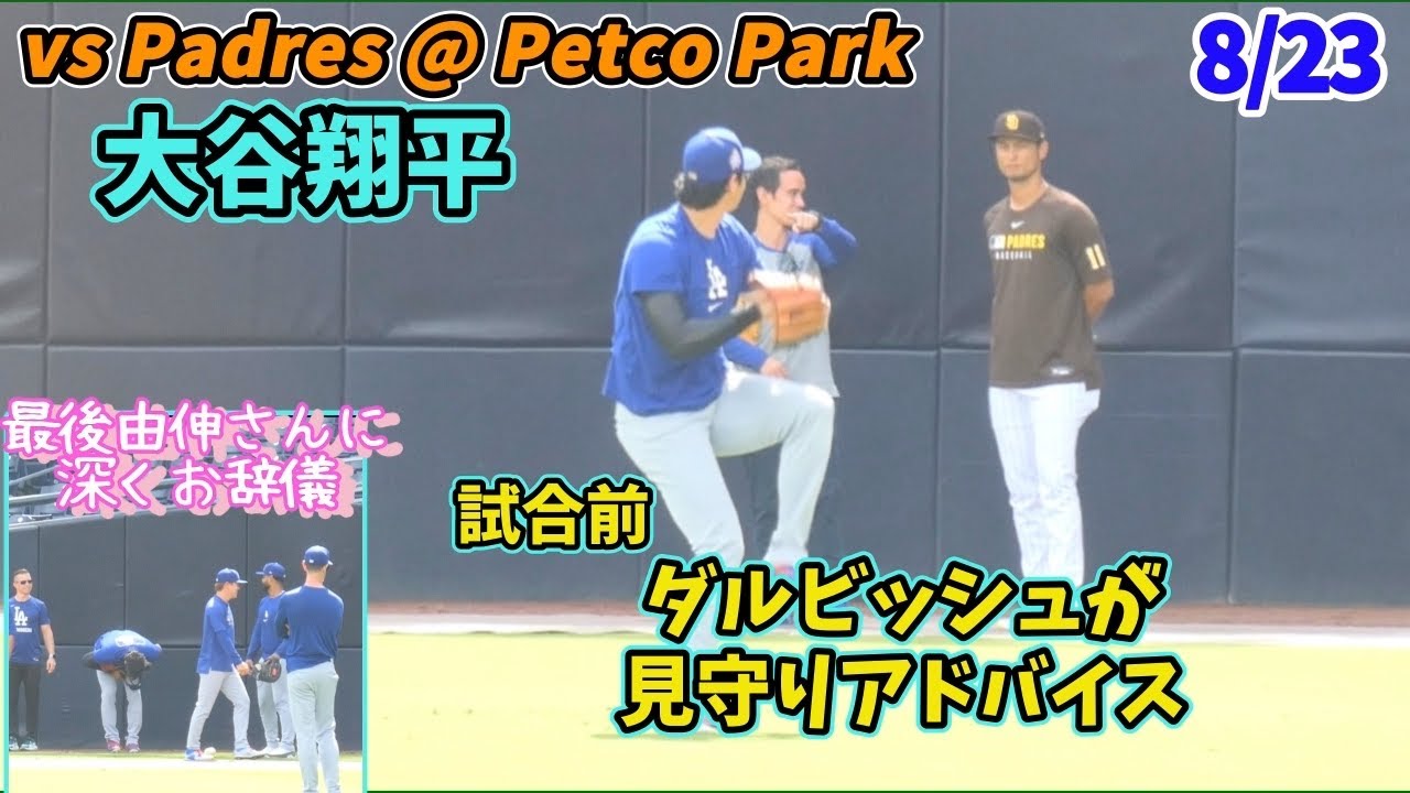 8/23 Dodgers vs Padres戦前の練習風景がすごすぎた!大谷さんダルビッシュ投手の隣で練習、アドバイスされている?!由伸さんもダルに挨拶、レアなアイアトンさんとキャッチボール風景、練習終わりに由伸さんに深くお辞儀する大谷さん笑える𐤔𐤔
