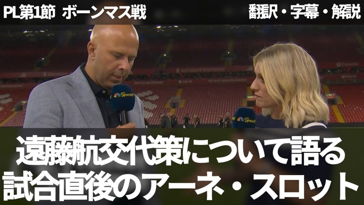 リヴァプールはプレミアリーグの開幕戦であるボーンマス戦を、4-2で勝利した。2-0とリードしている段階で、少し早めながら60分から、遠藤航が右サイドバックで投入されたものの、そこからまさかの2失点で、一時は同点まで追いつかれる。試合後のインタビューで、アーネスロットはこの交代について、ジョーゴメスは負傷明けからまだ十分な準備ができておらず、遠藤航はコンディションが準備できていたといい、その後には失点もあり、中盤に必要だったために遠藤航をポジション移動させたと話している。