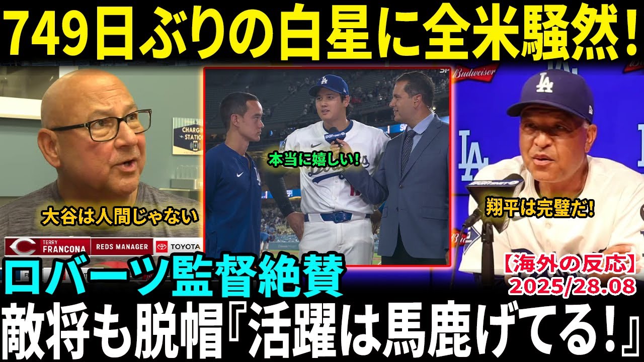 ドジャース大谷翔平がついに749日ぶりの白星!本拠地でのレッズ戦で5回9奪三振1失点の快投を披露し、指揮官デーブ・ロバーツ監督から「完璧な活躍」と絶賛、敵将フランコーナ監督までも「アメージング」と脱帽しました。