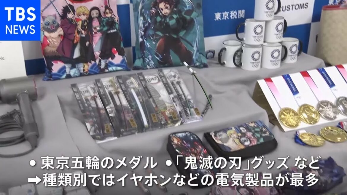 東京税関は4日、去年1年間に輸入を差し止めた偽ブランド品などが5年連続で19万点を超えたと発表しました。東京オリンピックのメダルの偽物や人気アニメ「鬼滅の刃」のグッズのほか、種類別で最も多いのはイヤホンなどの電気製品だということです。