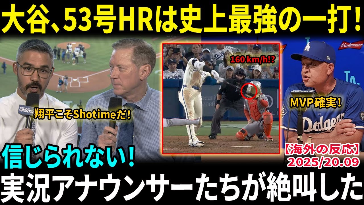 【大谷翔平】2戦連発の53号ホームラン 160キロ粉砕…実況アナウンサーたちが絶叫した「翔平こそShotimeだ!」シュワーバーに並びトップタイ、自己最多54発にあと1本!【海外の反応/MLB/野球】