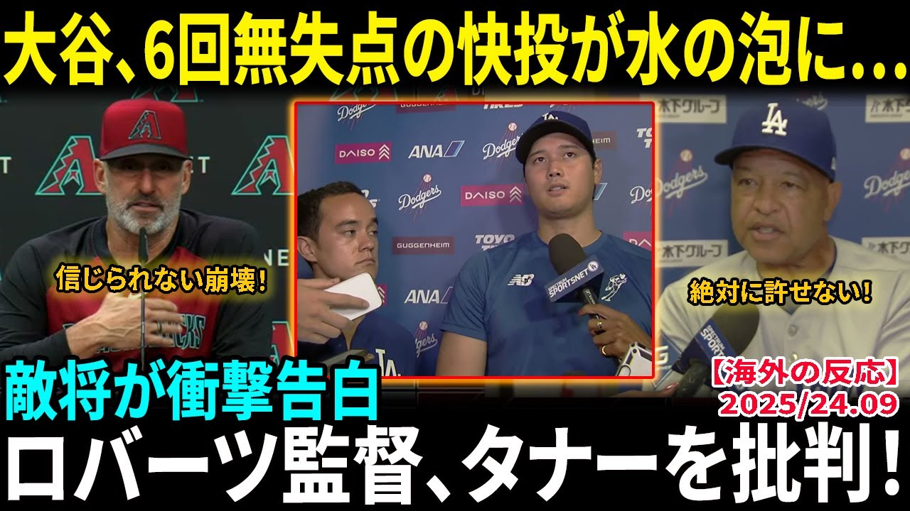 【大谷翔平】6回無失点の快投もド軍ブルペン大崩壊!敵将が衝撃告白「大谷があれほどの快投を見せたのに…」ロバーツ監督も堪えきれずタナーを批判!【海外の反応/MLB/野球】