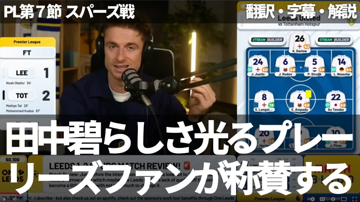 リーズ・ユナイテッドは、プレミアリーグ第7節で、トッテナム・ホットスパーと対戦し、2-1で敗戦した。田中碧は67分から途中出場し、いくつか良いプレーも見せつつ、決定機も演出したものの、実際には得点までには繋がらなかった。One Leeds チャンネルのマッチリアクション動画では、田中碧が見せた少しの違いを称賛しつつ、田中碧がやったようなプレーがもっと必要だと話している。