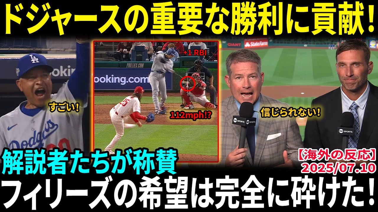【大谷翔平】ドジャースの重要な勝利に貢献!112マイルのシングルヒットに実況絶叫「これがフィリーズの希望を打ち砕いた一打だ!」スネルも6回無失点9奪三振の快投【海外の反応/MLB/野球】