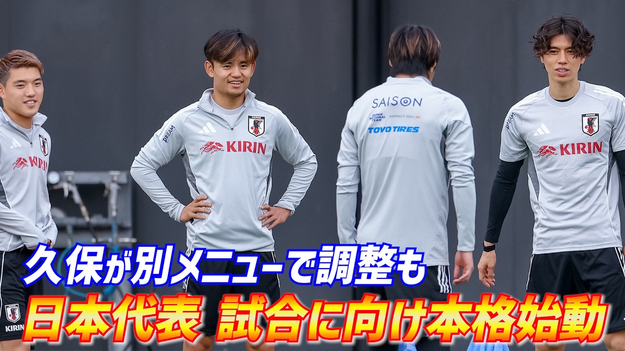 日本代表は8日、キリンチャレンジカップのパラグアイ戦(10日・パナスタ)、ブラジル戦(14日・味スタ)に向け、千葉市内で合宿3日目のトレーニングを行った。冒頭15分間が報道陣に公開され、左足首を負傷しているMF久保建英(ソシエダ)が別メニュー。25人がランニングやボール回しでウォーミングアップした。