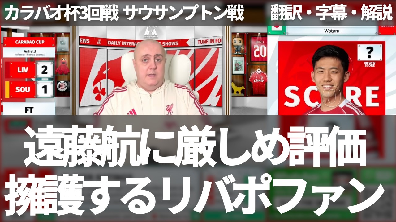 リヴァプールは、エヴァートン戦から中2日で、カラバオカップのサウサンプトン戦を迎え、前の試合から先発11人の全員を変更して望み、2-1でなんとか勝利を上げた。Anfield Agendaのプレーヤーレーティング動画では、他の多くのリヴァプールファンも同じように、遠藤航については、少し厳しい評価をしている。