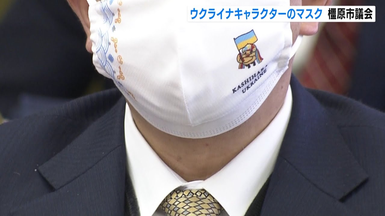 議員らが着用するマスクに描かれているのは、ウクライナの国旗を掲げ、民族衣装を身に着けたキャラクターです。橿原市は去年の東京五輪でウクライナのホストタウンとなり、キエフ国立大学の学生を受け入れるなど交流をはかってきました。橿原市は3月9日付でロシア大使館に抗議書を送っていて、マスクの着用で改めて一刻も早い平和的解決を求めました。