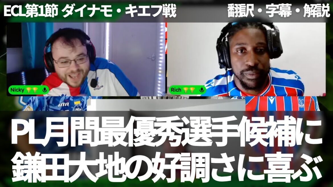 クリスタルパレスは、ヨーロッパカンファレンスリーグの第1節でダイナモ・キエフと対戦し2-0で快勝した。鎌田大地は69分までプレーし、相変わらず好調さを維持し、素晴らしいプレーも多くあったことが伺える。クリスタルパレスのファンチャンネルであるEagle-Eyed Footballの同時視聴の動画の中で、試合直後にプレーヤーレーティングを行っている。鎌田大地については、期待もどんどん大きくなっていること、その期待にもいつものように応えてくれたことだけでなく、プレミアリーグの月間最優秀選手にノミネートされたことと、クリスタルパレスとの契約延長の交渉に入った話もしながら、嬉しさを話している。