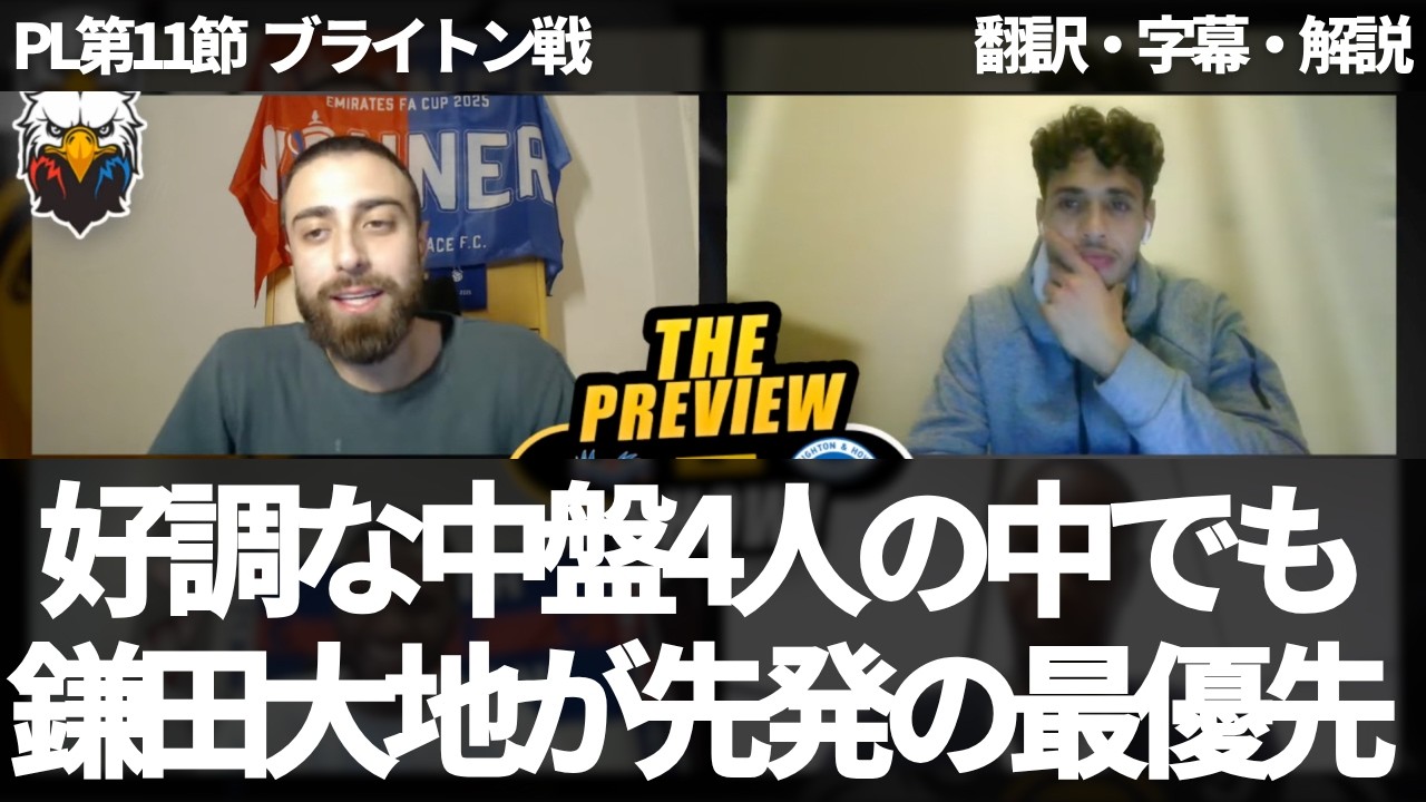 クリスタルパレスは、プレミアリーグ第11節で、三笘薫擁するブライトンと対戦する。クリスタルパレスは、パレスファンのプレビュー動画では、守備陣と攻撃陣のメンバーは自然と決まるが、中盤の二人は、誰がでてもおかしくないといった感じで話している。ヒューズもレルマも良いパフォーマンスを見せており、ウォートンが体調不良明けでもあり、鎌田大地が最優先で起用されるべきだと話している。