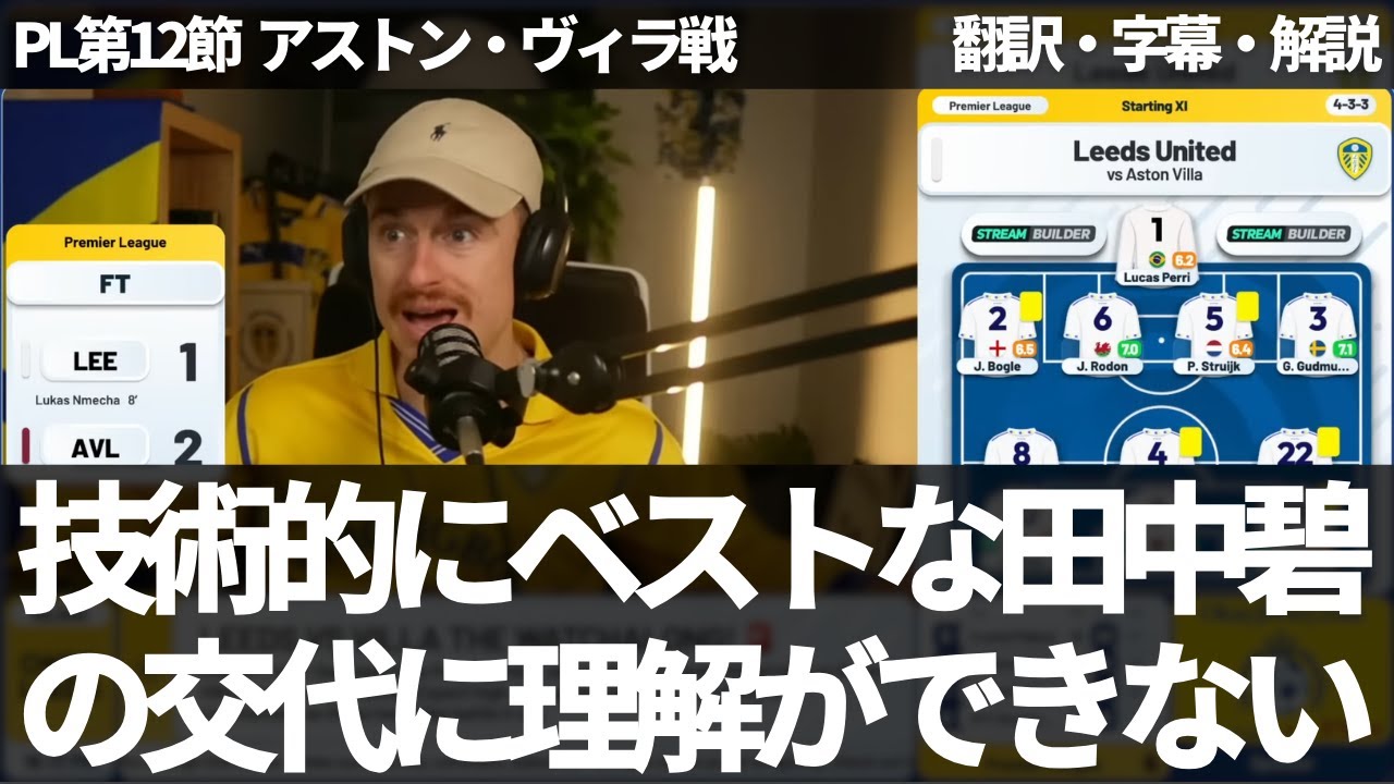 リーズユナイテッドは、プレミアリーグ第12節で、アストン・ヴィラと対戦し、先制しながらも終盤に逆転され、2-1で惜しい敗戦を喫した。田中碧は、アントンスタックの脳震盪によって前半23分から途中出場したものの、71分に途中交代したことが、リーズファンの間でも物議を醸しています。One Leedsチャンネルでは、レビュー動画の中で、この交代について批判し、田中田中碧がリーズの中盤で素晴らしいプレーをし、他の選手ができないプレーと役割をしていたこと、特にディフェンダーとアタッカーの繋ぎ役となるコネクターと表現し、そのコネクターがいなくなる意味の大きさを話している。