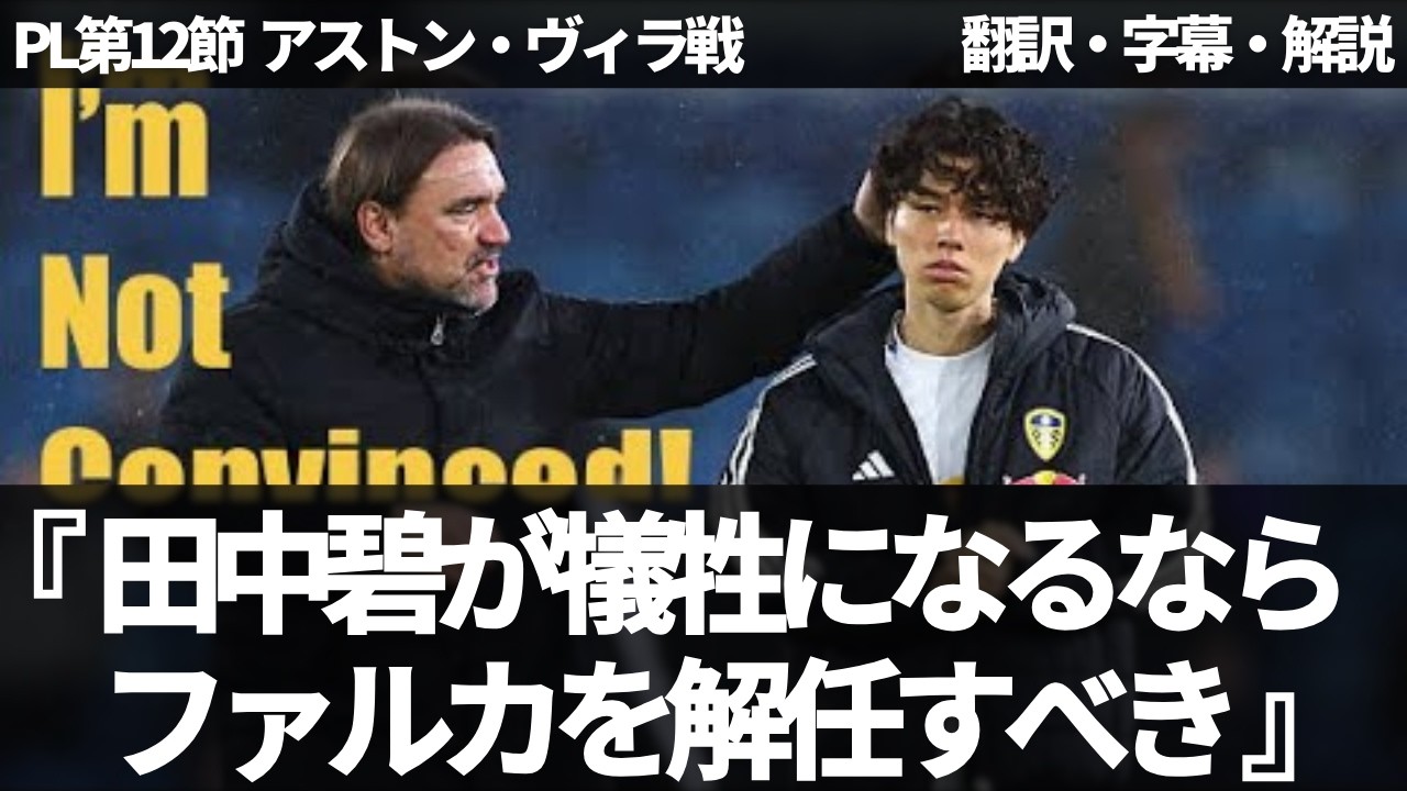 リーズユナイテッドは、プレミアリーグ第12節で、アストンヴィラに2-1で敗戦した。田中碧は、前半23分から途中出場したものの、71分に途中交代したことが、リーズファンの間でも物議を醸している。リーズファンのKagey 1v1チャンネルでは、レビュー動画の中で、この交代について批判し、田中碧が移籍することがあるならファルケが解任されるべきだと話している。