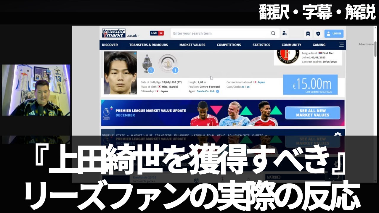 上田綺世は現在絶好調で、リーグ戦で18ゴール、ヨーロッパリーグで1ゴールを上げ、合計19ゴールを量産している。リーズファンのチャンネルでは、この上田綺世の移籍の噂に対してリアクションしているが、是非獲得すべきだと主張する。
