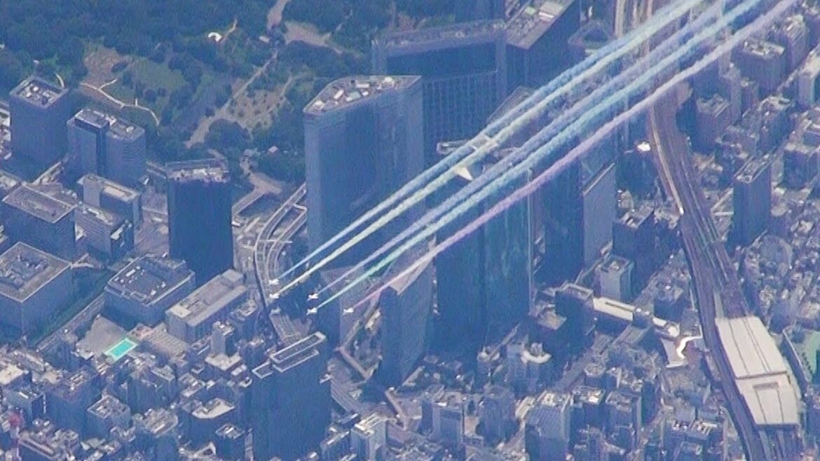 #東京五輪 の開会式に合わせ、#航空自衛隊 のアクロバット飛行チーム「#ブルーインパルス 」は23日、#東京都心 の上空を飛行し、#カラースモーク で空に五輪マークを描いた。