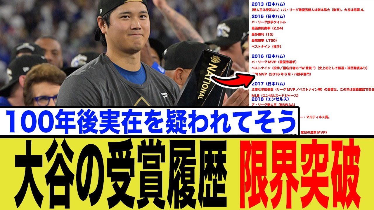 野球界の常識を覆し続ける大谷翔平選手の、NPB時代からMLB、WBCまでの全受賞履歴を徹底深掘り!史上初のベストナインW受賞、複数回の満票MVP、そしてリーグをまたぐMVP獲得など、その受賞の「数」と「質」が示す、大谷選手の異常なまでの偉大さに迫ります。なぜ彼だけがこのような歴史的な快挙を成し遂げられるのか?その驚異のキャリアを詳細な解説と多角的なネットの反応と共にお届けします。