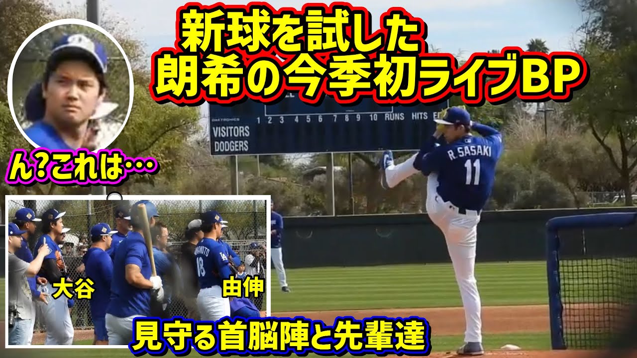 ドジャースのスプリングトレーニングで佐々木朗希投手のライブBPとそれを見守る大谷翔平選手の様子です。