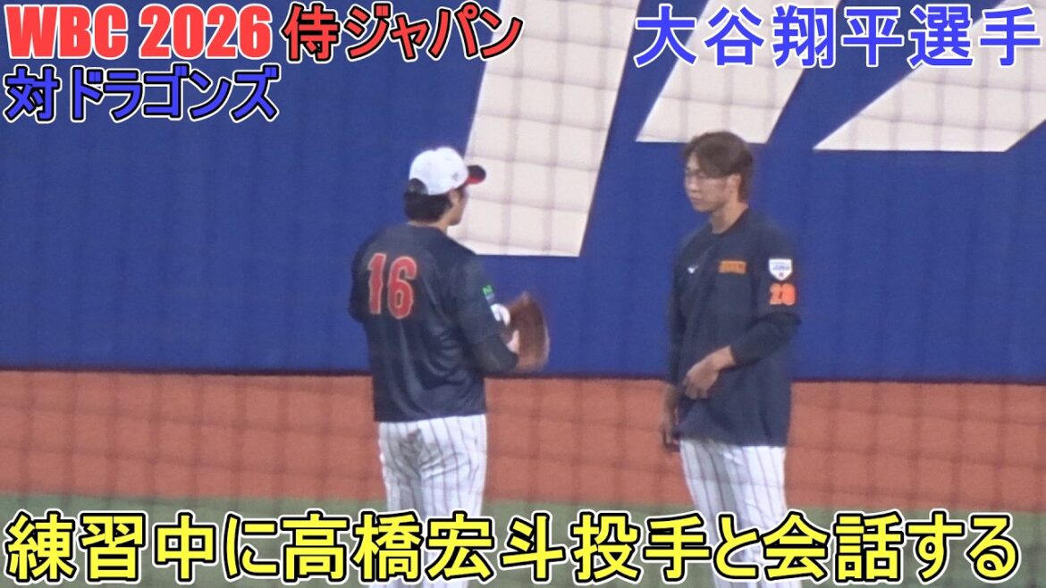 キャッチボールと遠投をする大谷翔平選手。練習中に高橋宏斗投手と会話をする。