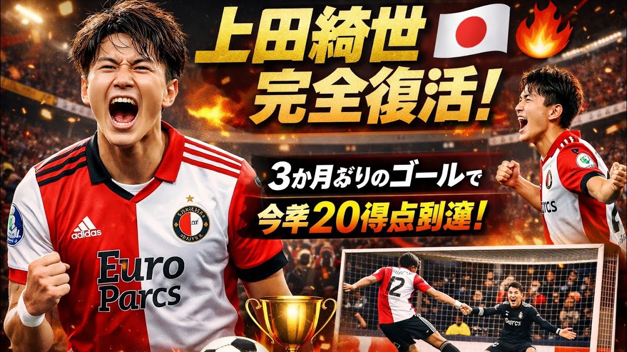 オランダ1部リーグで活躍する🇯🇵日本代表FW上田綺世がついに完全復活!⚽✨ フェイエノールトの試合で3か月ぶりのゴールを決め、さらに追加点も奪って今季20得点に到達しました🔥🙌 チームは激しい打ち合いの末3-3のドローでしたが、エースストライカーの復活は大きなニュースです。 2026年北中米W杯に向けて、日本代表の期待もさらに高まっています!🌍🏆 fifa world cupfootballJapansoccerWorld Cupエールディビジサッカーフェイエノールト上田綺世日本日本代表 NIHON2020.COM