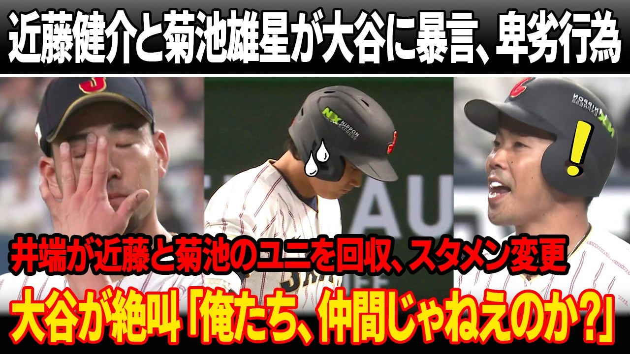 マイアミ到着後の会議で近藤健介と菊池雄星が大谷に暴言、卑劣行為!井端監督が近藤と菊池のユニを回収、スタメンを変更!大谷、ロッカー蹴り絶叫