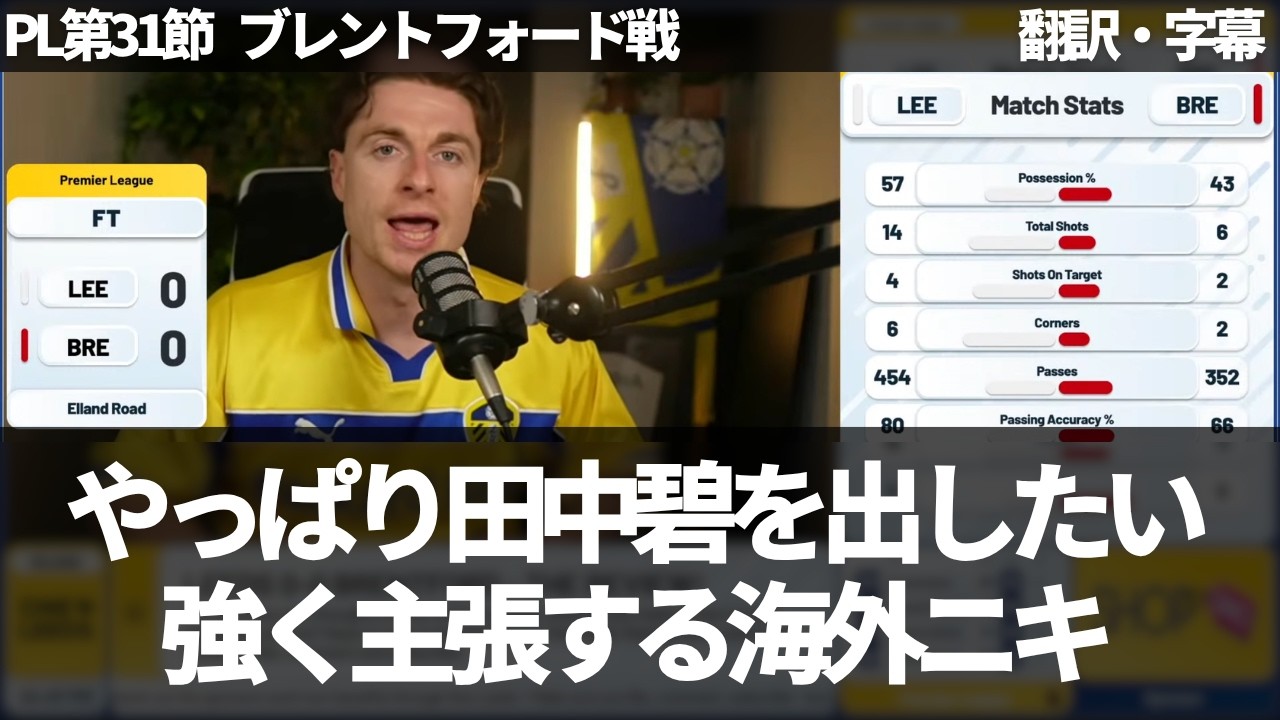 プレミアリーグ第31節のブレントフォード戦で0-0で引き分けたリーズユナイテッド。田中碧はこの試合でももちろんベンチスタートとなったが、68分に途中出場となり、これが1月末以来、9試合ぶりのプレミアリーグでの出場となった。プレーに関わる場面が、それほど多くなかったものの、ボックス外からのミドルシュートや、ボール回しでテンポを作ろうとするなど、まずまずのパフォーマンスだったように見えた。One Leedsのコナーは、田中碧の出場を持ち望んでいたかのように、もっと早い時間帯で選手交代が必要だったし、田中碧が入って試合も変わったことを強調しながら、もっと出場時間が与えられるべきだと叫んでいる。