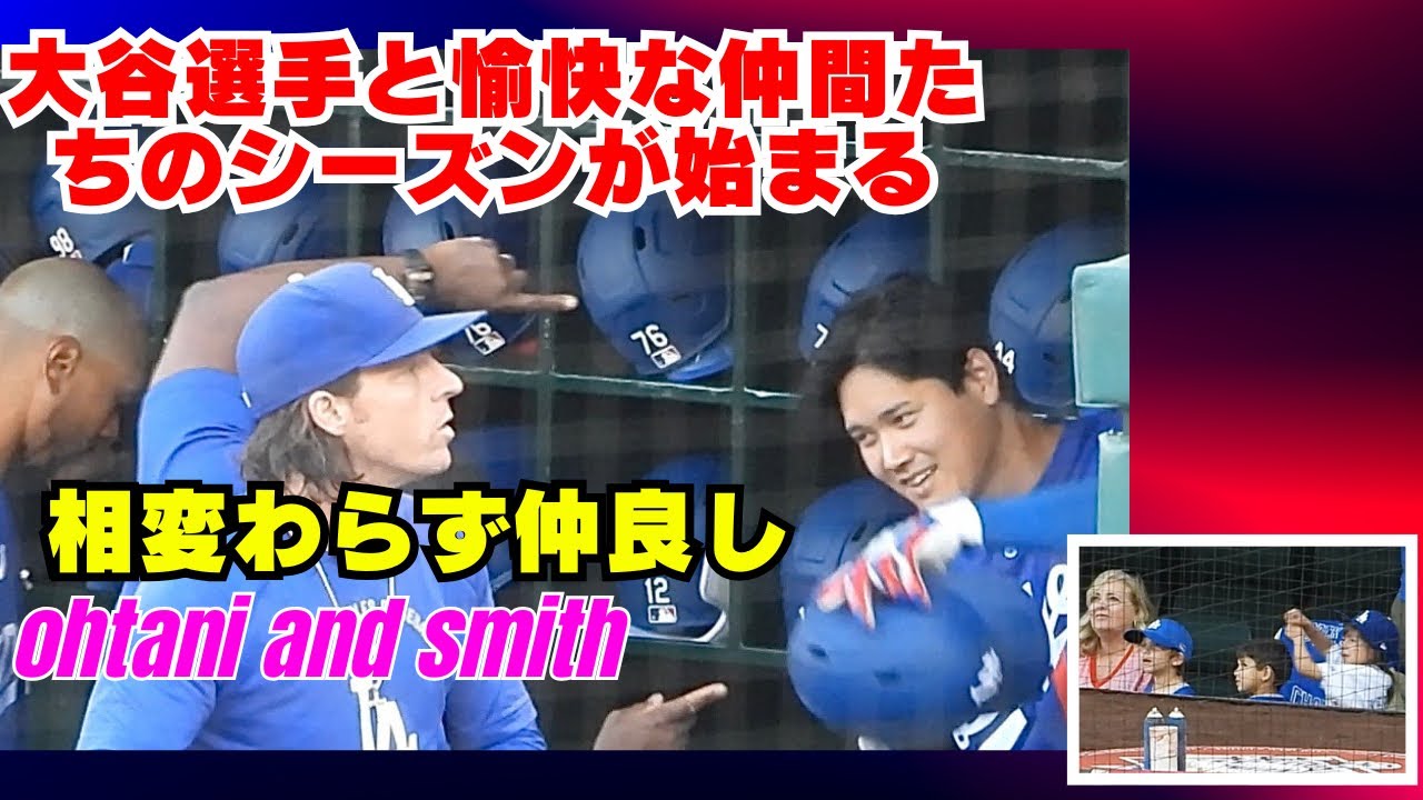大谷翔平&スミスコーチの久々の試合前の掛け合い。レギュラーシーズンがもう直ぐ始まるな、という期待感が膨らみます。エンジェルス名物のプチセレブ席にいたちびっ子が大谷選手の素振りを真似ていて可愛い!!