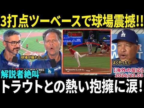 【大谷翔平】3打点ツーベースで球場震撼!! 解説者絶叫「やはり格が違う!」試合前のトラウトとの熱い抱擁にファン涙【海外の反応/MLB】