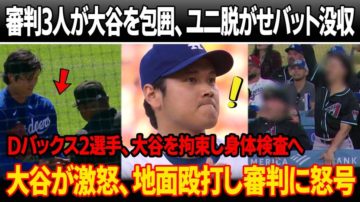 試合直後、3人の審判が大谷を取り囲み、ユニフォームを脱がせ、バットを没収した ! ダイヤモンドバックス2選手、大谷を拘束し身体検査へ ! 大谷激怒、地面殴打し審判に怒号