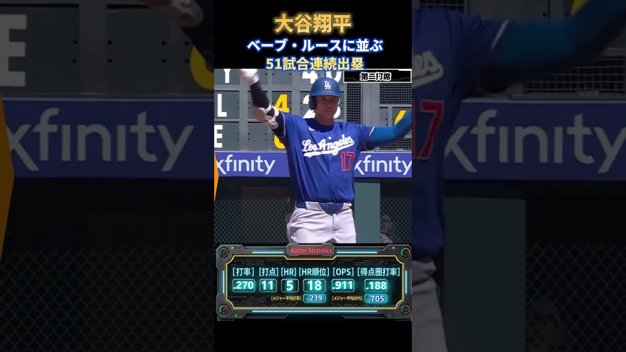 ドジャース・大谷翔平投手は19日(日本時間20日)、敵地で行われたロッキーズ戦に「1番・指名打者」で先発出場。第2打席で適時二塁打を放ち、昨年から続く連続試合出塁を「51」に伸ばし、ベーブ・ルースの記録に並んだ。
