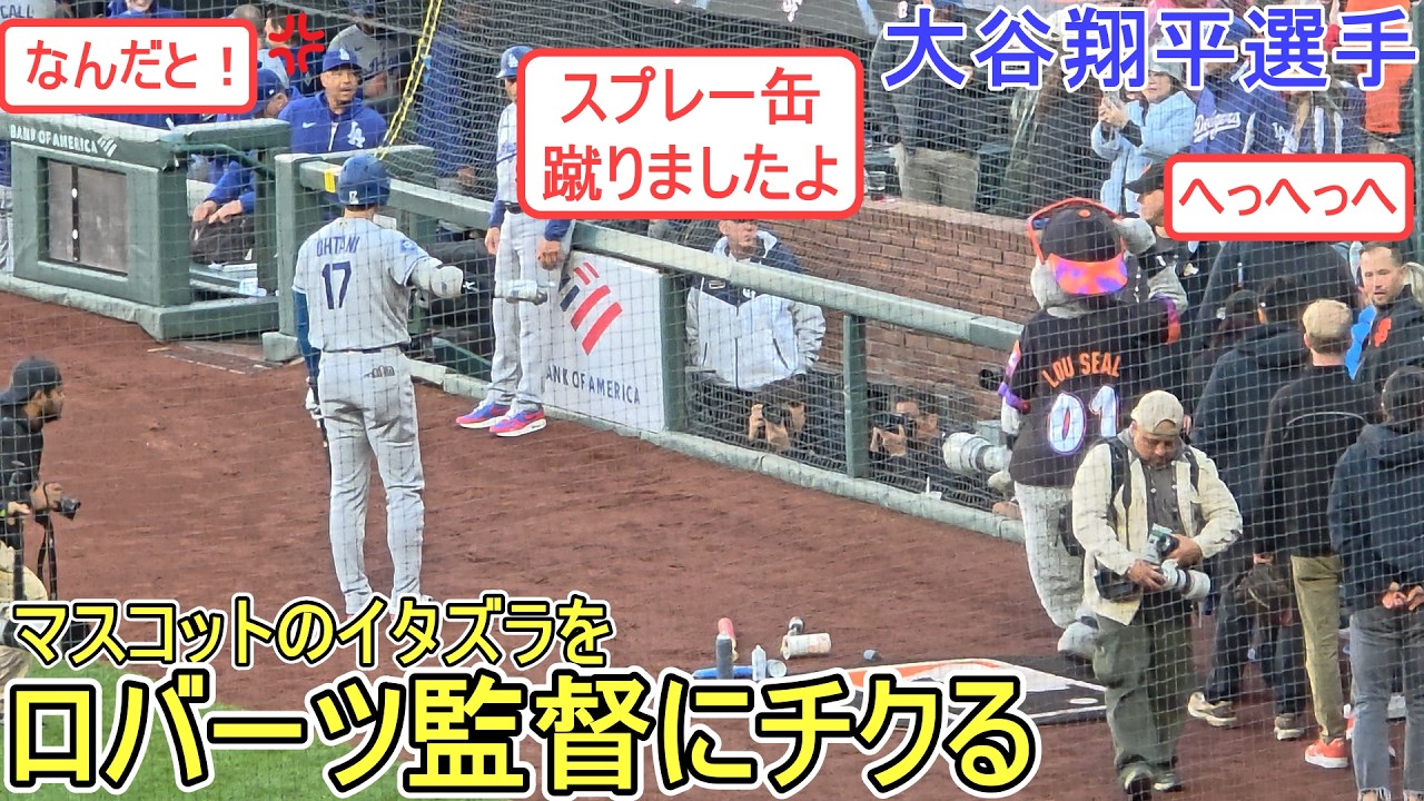 ♦試合直前のネクスト♦サンフランシスコ・ジャイアンツのマスコットがスプレー缶を蹴るいたずらを、ロバーツ監督にチクる大谷翔平選手。対サンフランシスコ・ジャイアンツ~シリーズ初戦~ 1番DHで出場の大谷翔平選手 2026.04.21 @shinsukehandyman #ShoheiOhtani #大谷翔平 #dodgers 2026BaseballDodgersGiantsJapanMajor League BaseballMLBohtaniOhtani ShoheiSan FranciscoshoheiShohei OHtaniコロラドサンフランシスコジャイアンツドジャースロッキーズ大谷大谷翔平日本翔平 NIHON2020.COM