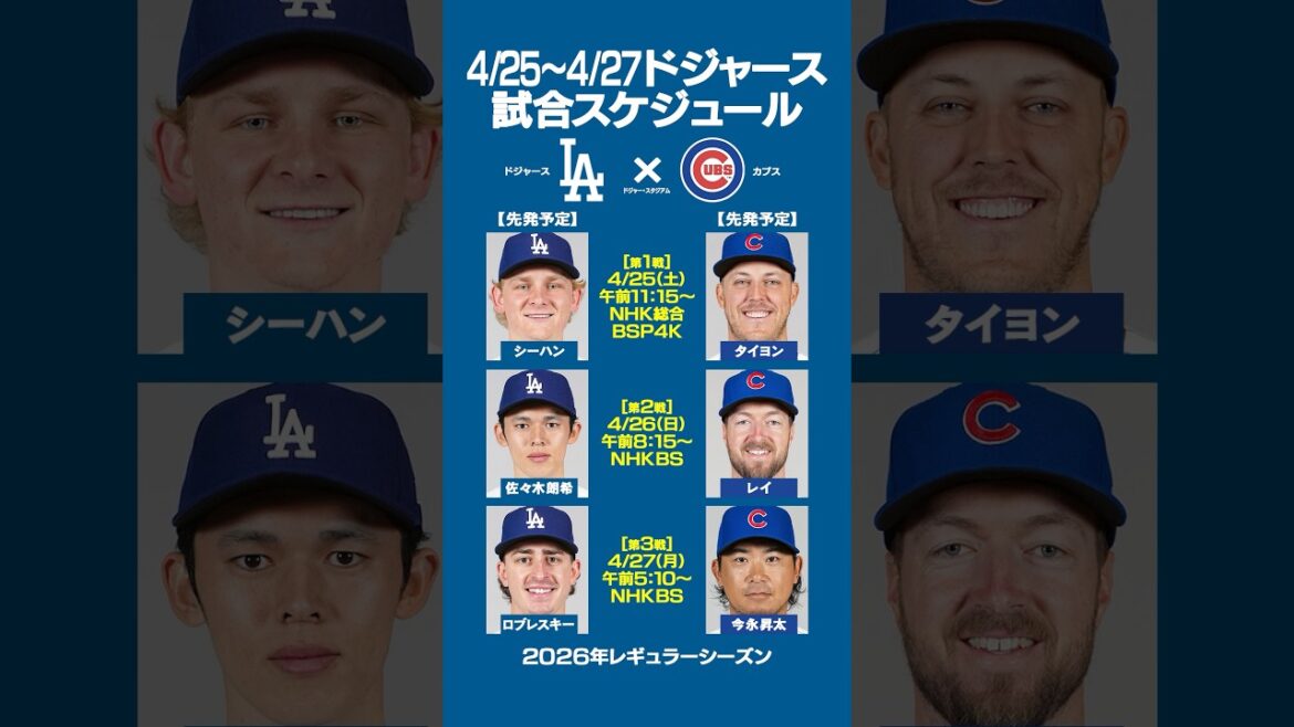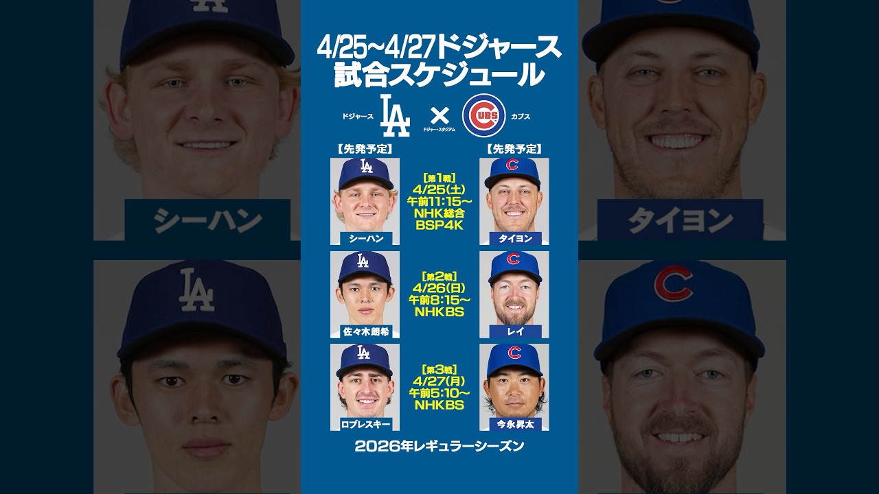 2026年4月25~27日(日本時間)ドジャー・スタジアムで今季初の「ドジャースvsカブス」3連戦が行われます‼️😆3連戦では佐々木朗希・今永昇太の登板が予定されております😊佐々木朗希vs鈴木誠也、大谷翔平vs今永昇太の侍対決に注目です🔥#野球 #baseball #mlb #dodgers #shoheiohtani #メジャーリーグ #プロ野球 #今永昇太 #山本由伸 #サイヤング賞 #侍ジャパン BaseballCabsChicagoJapanMajor League BaseballMLBotaniseiyasuzukishota imanatgaドジャース日本村上宗隆鈴木誠也 NIHON2020.COM