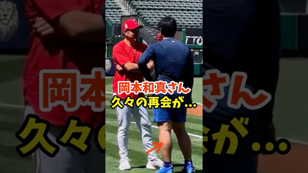 エンゼルスタジアム、試合前の練習。ブルージェイズ・岡本和真が、エンゼルス・菊池雄星に歩み寄り、満面の笑み。がっしりと並んで、WBC以来の談笑。