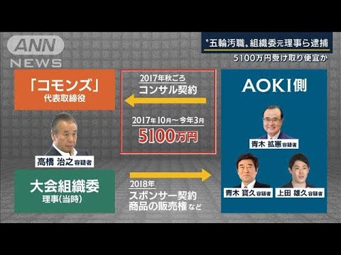 関係者によりますと、AOKI側は、2017年秋ごろ、高橋容疑者が代表を務めるコンサルタント会社『コモンズ』と契約を結びました。翌年、AOKI側は、組織委員会とスポンサー契約を結び、公式ライセンス商品を販売します。