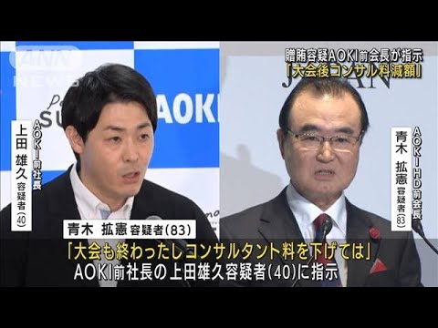 2017年から去年9月までコンサルタント料として毎月100万円が支払われていましたが、関係者への取材でAOKIホールディングスの前会長・青木拡憲容疑者が「大会も終わったしコンサル料を下げてはどうか」とAOKI前社長の上田雄久容疑者(40)に指示し、閉幕後の10月から支払いが半額になったことが分かりました。