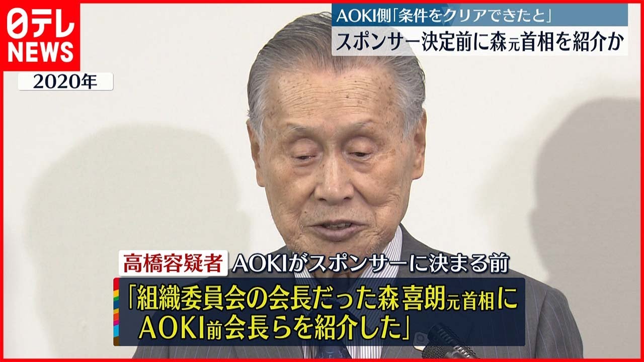 その後の関係者への取材で、高橋容疑者が東京地検特捜部の調べに対し、「AOKI」が大会スポンサーに決まる前、「組織委員会の会長だった森喜朗元総理に『AOKI』前会長らを紹介した」と供述していることが分かりました。ただ、スポンサー選定については「森元総理に具体的なことは話していない」と説明しているということです。