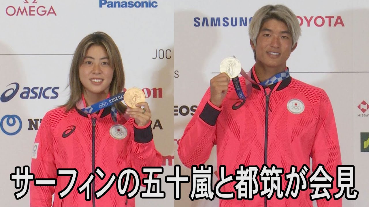 千葉県一宮町の釣ケ崎海岸サーフィンビーチで27日行われた東京五輪のサーフィン男子決勝で、銀メダルに輝いた五十嵐カノアと女子で銅メダルに輝いた都筑有夢路が東京都内で記者会見を行った。