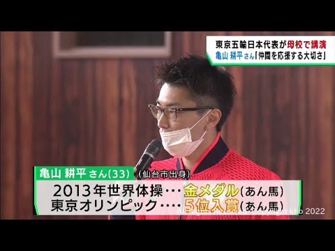 仙台市出身で東京オリンピック体操日本代表の亀山耕平さんが、母校の小学校で講演を行い仲間を応援することの大切さを伝えました。