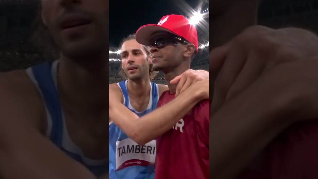 The moment Italy’s Gianmarco Tamberi and Qatar’s Mutaz Barshim decide to SHARE the high jump gold medal at the 2020 Tokyo Olympics? Not a dry eye in the house. #shorts #olympics #highjump