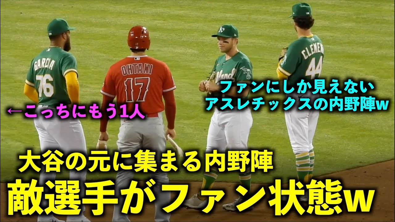もうファンにしか見えないw 大谷翔平の元にアスレチックスの内野手4人が集うw エンゼルス【現地映像】10月3日 第1戦
