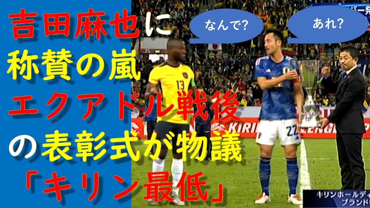 キリンチャレンジカップのエクアドル戦試合後、協賛企業であるキリンホールディングスによる表彰式が実施。引き分けのため、両チームのキャプテンにトロフィーが授与されるが、キリンのブランド戦略部長は吉田麻也のみに手渡そうとしたのだ。