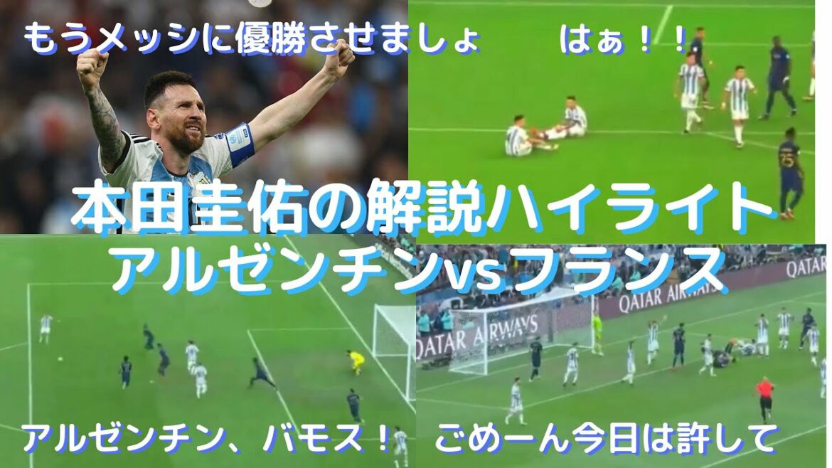 本田圭佑W杯決勝の解説ハイライト!!アルゼンチンvsフランス(22.12.19、3−3:PK4−2)は偏った解説も熱狂と爆笑の最高のエンターテインメント!「もうメッシに優勝させましょ」「バモス」「槙野ー!」「ごめーん!今日は許して」など名言連発!