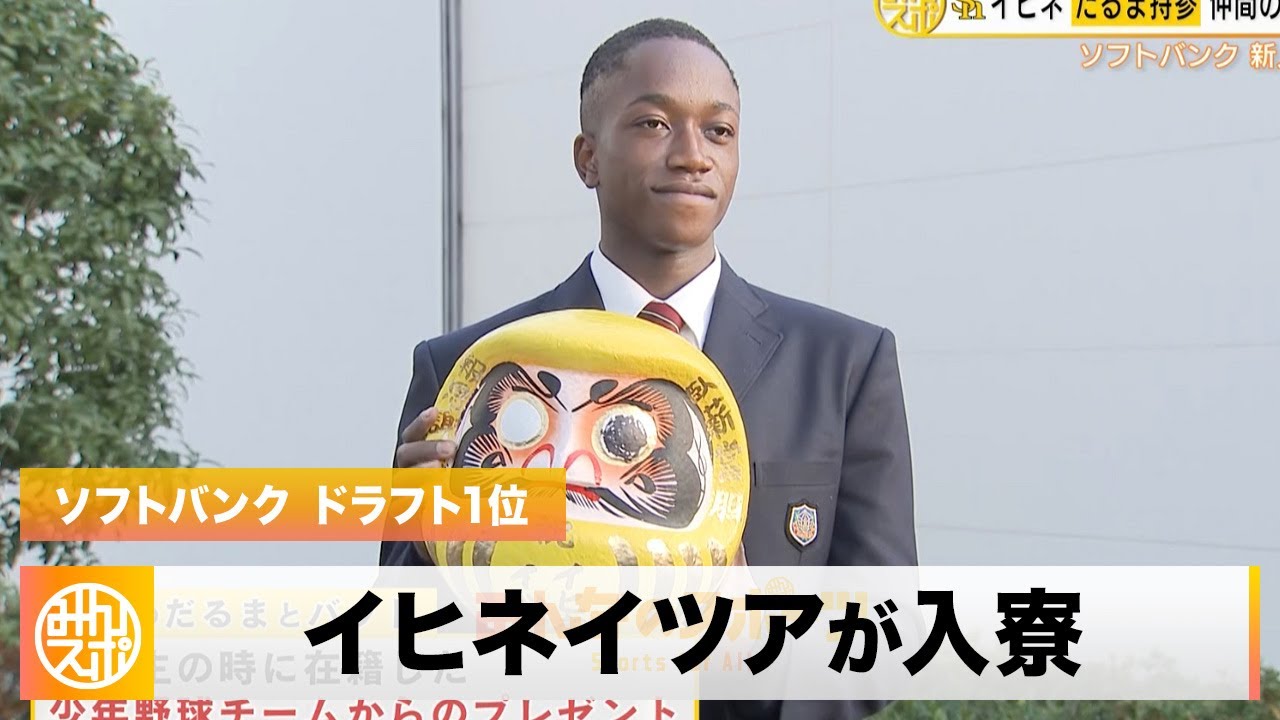 ソフトバンクのドラフト1位・イヒネイツア(18)がチームカラーに染まった黄色いダルマとバットを持って入寮。