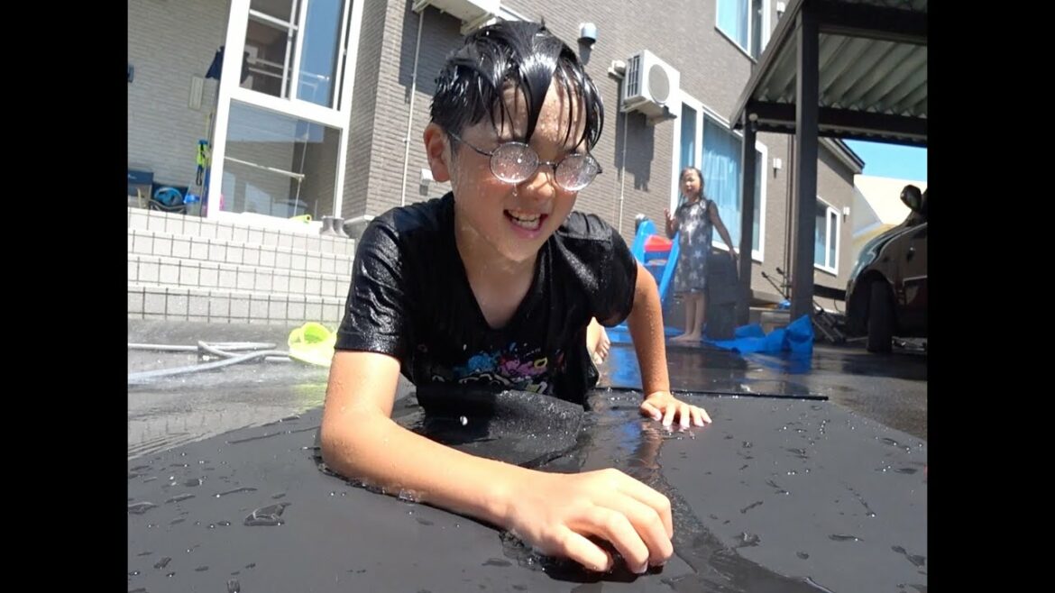 暑すぎるので庭にゴムマット引いて水を撒き、