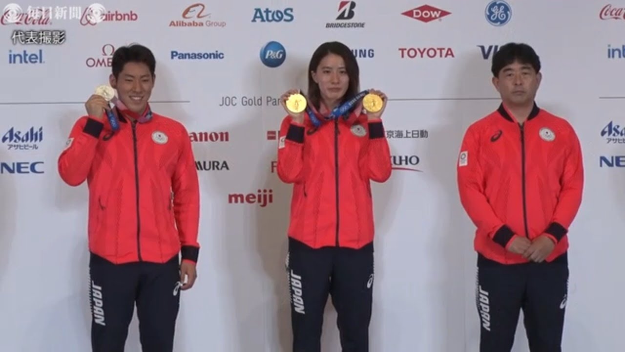 東京オリンピックの競泳で女子個人メドレー2冠の大橋悠依、男子200メートルバタフライ銀メダルの本多灯が日本代表の平井伯昌監督とともに会見した。(代表撮影)2021年8月2日公開