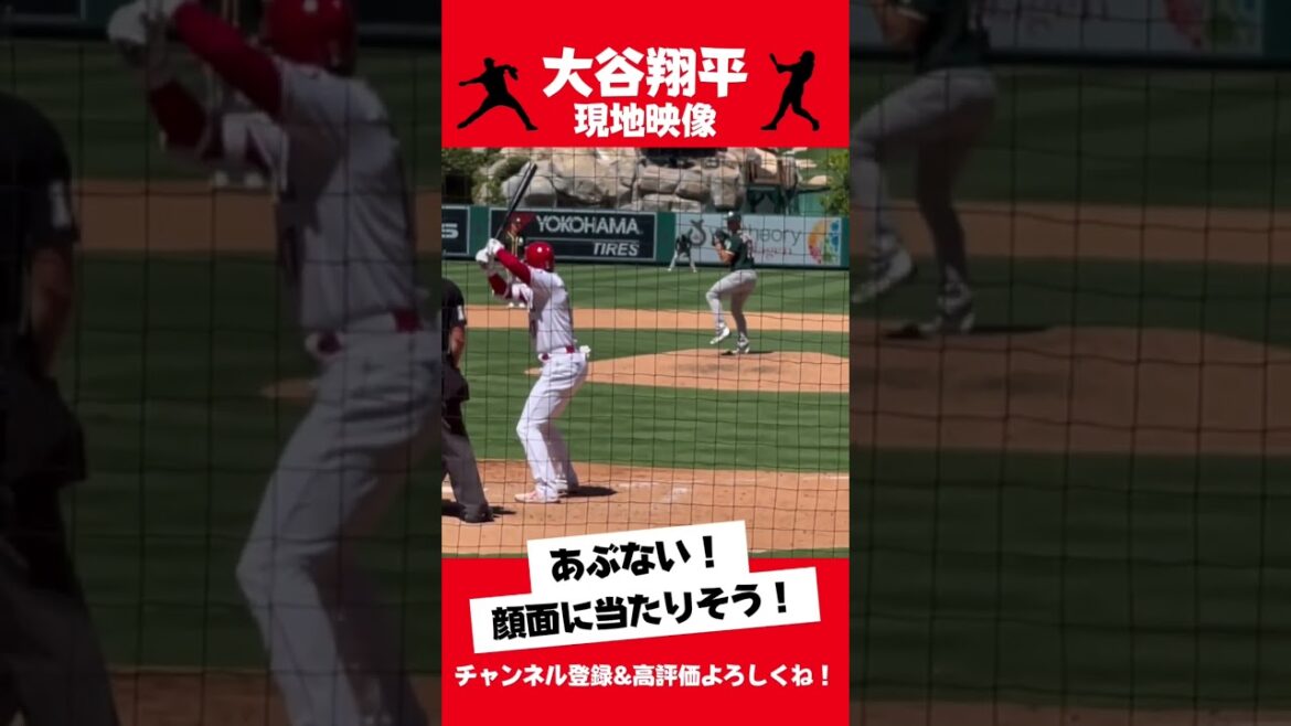 打席に立つ大谷翔平選手に顔面デッドボールギリギリのボールが飛んできて避ける様子です。