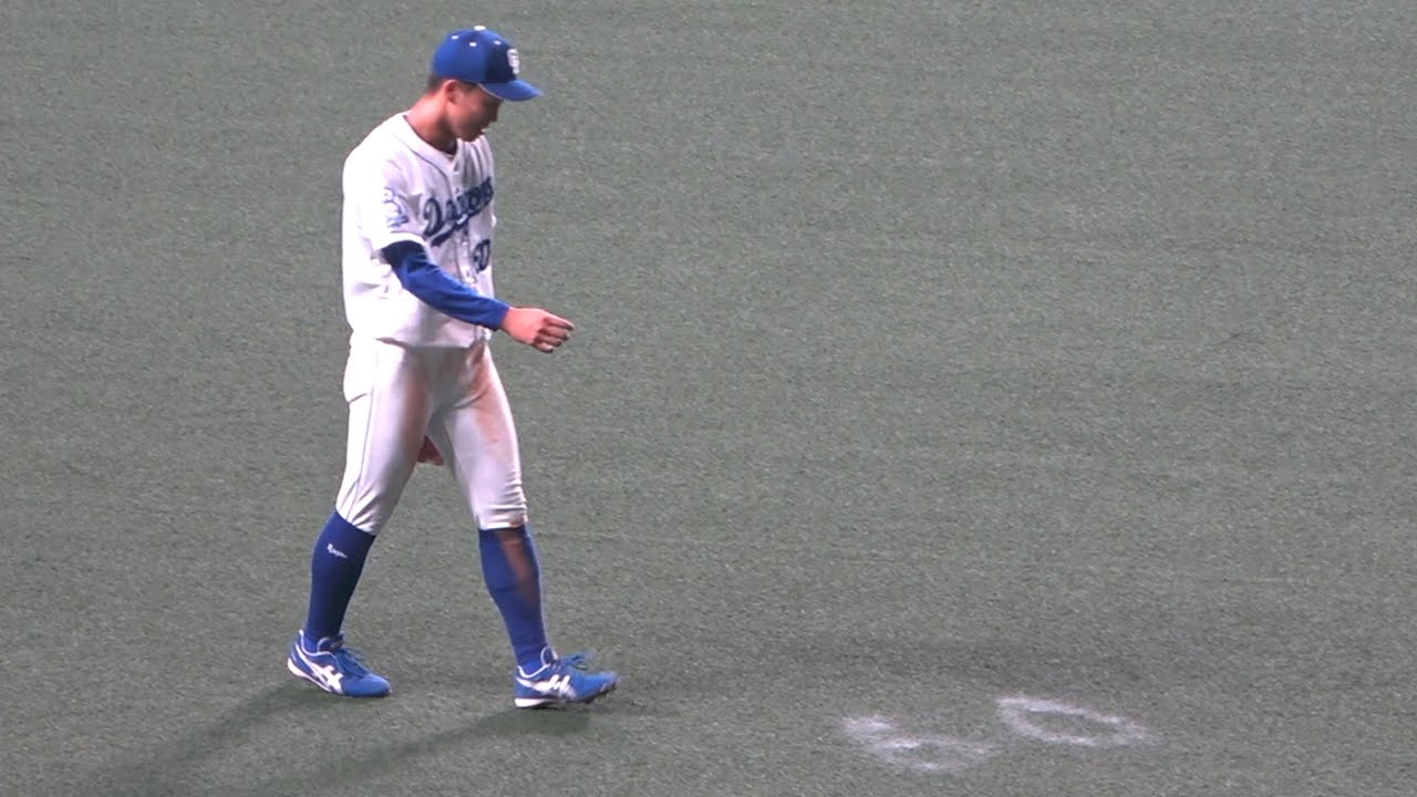 試合中、ライトの定位置に岡林の背番号60をラクガキしている鈴木誠也 (2021/10/07)